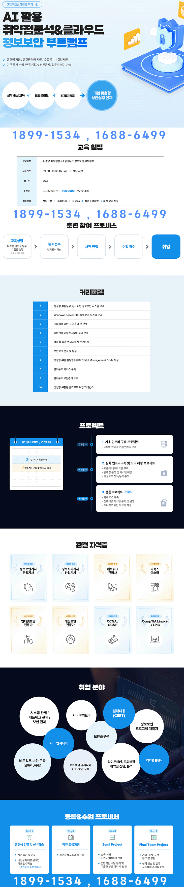 직업능력 우수훈련기관(5년 인증기관)?? -훈련비 국취1유형 전액무료 - AI를 활용한 정보보안 실무과정 - 비전공자 참여 가능(사전면접) - 인프라 구축 및 모의 해킹 프로젝트(침해 대응 시스템 구축) - 채용수요가 가장 많은 직무 - 프로젝트 발표 시 협력기업 실무자 피드백+즉석 채용면접 - 협력기업 취업 연계